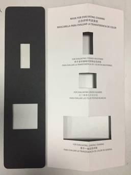 (如上圖)評級時所采用的遮樣卡,各小孔分別用于多纖維布沾色評定、摩擦擦色牢度沾色評定、一般性沾色評定(如:自沾色評定、單纖維布沾色評定)。