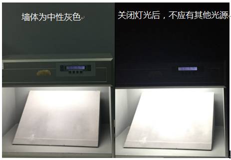 評級應(yīng)在恒濕恒室的暗房里進行評級,并將暗房墻體及其墻上物品的顏色刷為中性灰色,近似于評級灰卡1級到2級之間(近似于蒙賽爾色卡N5)。如上圖,左為開燈時墻體中性灰色,右圖為關(guān)燈后,要求整個暗室除評級燈箱的光源之外,不得出現(xiàn)任何其他光源。并且保證評級臺上不得出現(xiàn)其他雜物。